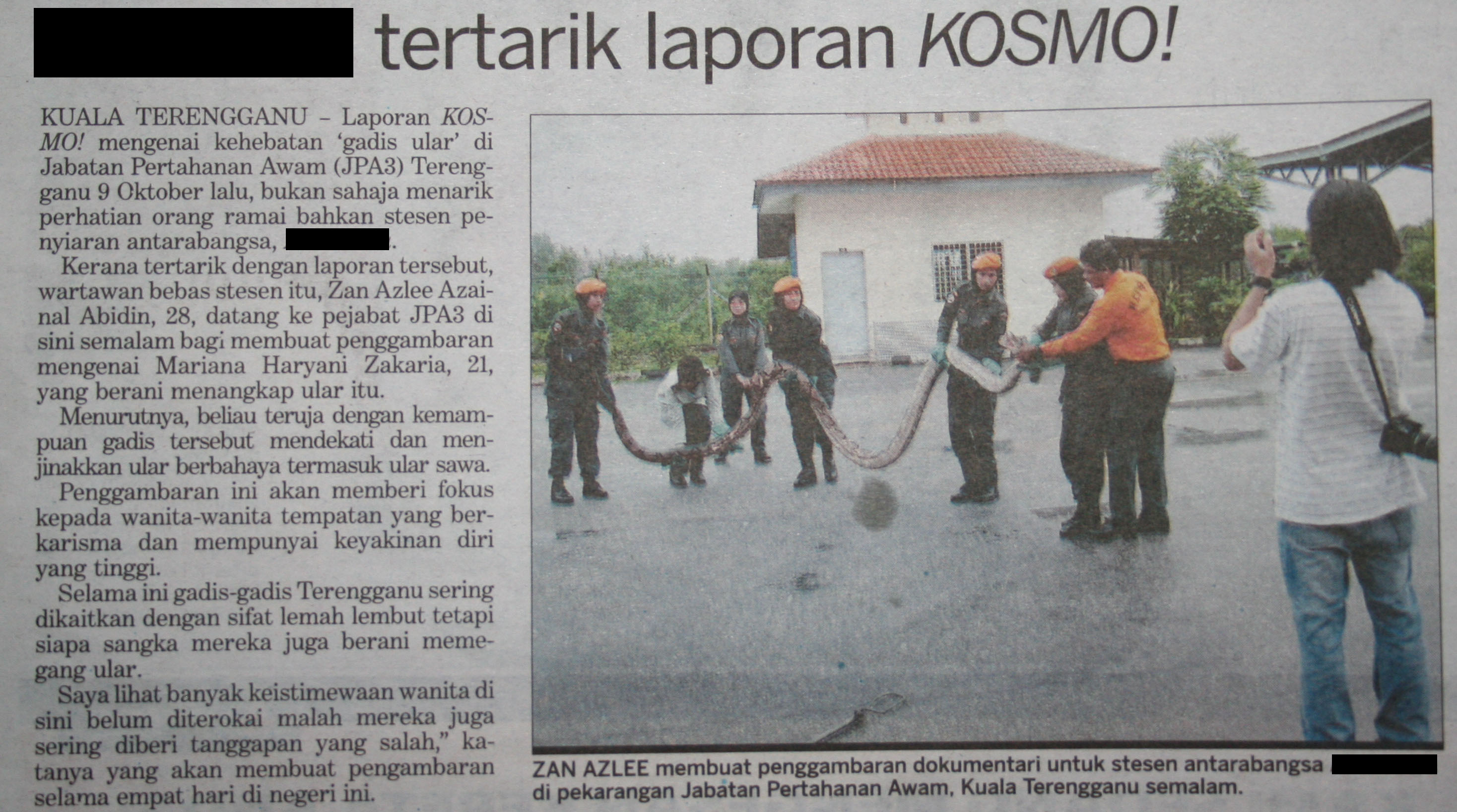 ‘The Look-East Project’ got some press coverage during the shoot in Terengganu. Funny thing is, Kosmo claims that I found out about the snake-wrangler girls from an article that appeared in their publication. The truth is that I read it in The Star! Haha! I didn’t even know Kosmo ran a similar article! And, they even misspelled my name! (Click here to read article)