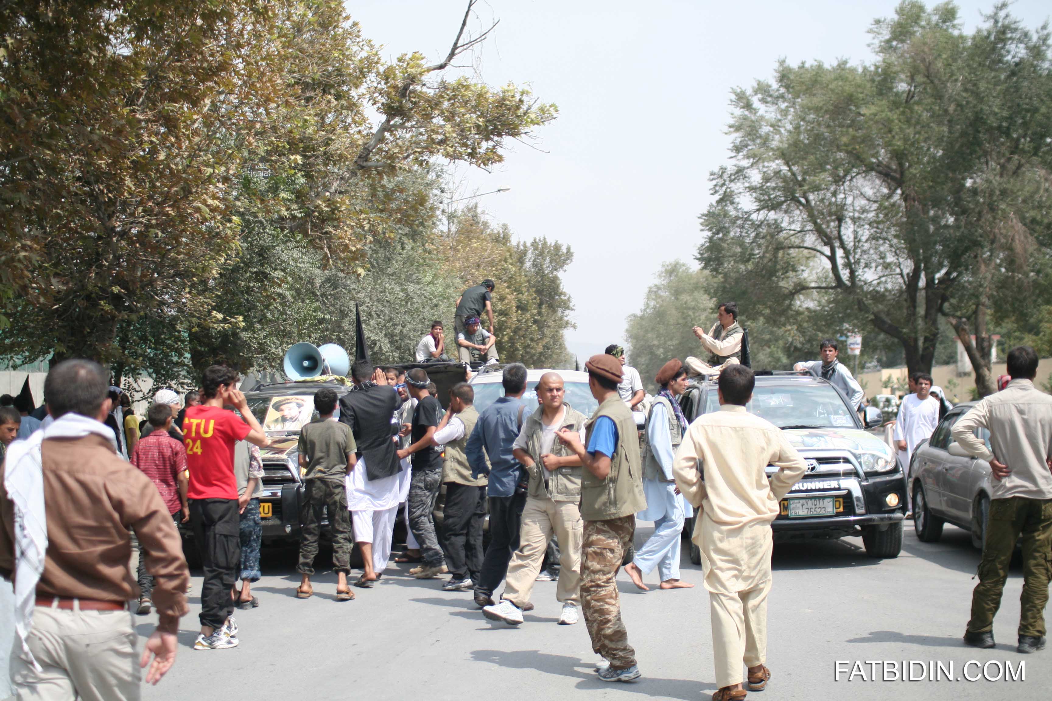 - Parade vehicles circling Massoud Square with ISAF NATO troops looking on from their perch.