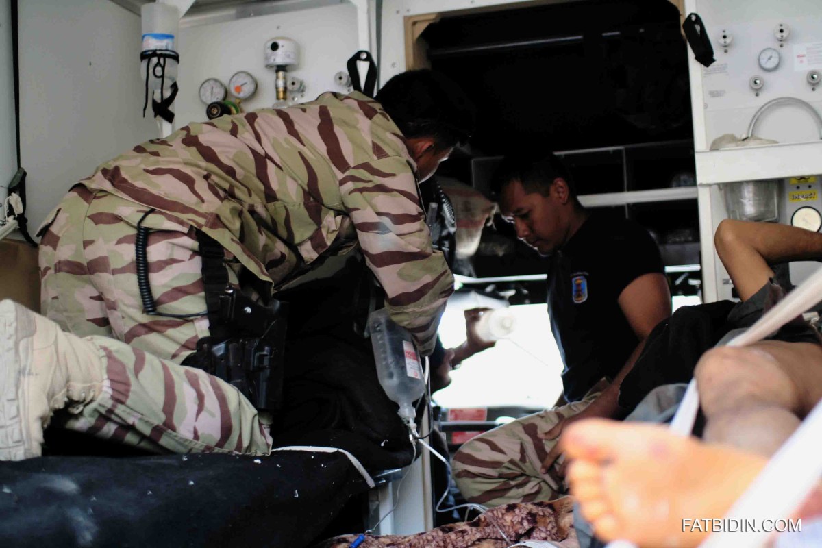 Major Arshil & Corp Saiful helping the injured ANP 2 (small)-watermarked Published February 6, 2012 at 3456 × 2304 in Guide to Afghanistan: The Adventures of a KL-ite (Part 9 – A Taliban ambush) ← Previous Next → Major Dr Mohd Arshil Moideen & Corp Mohd Saiful Karim helping the injured Afghan National Police (ANP).