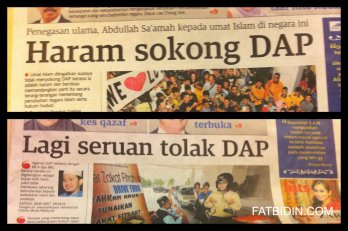 The story caused quite a buzz around the country and comments were made left, right and centre by all parties concerned. Then yesterday arrived and Utusan again came out with a front page story on the same issue, with a headline that screamed “Lagi seruan tolak DAP.” This time, the newspaper came up with a slew of other “religious” people to back up their first story declaring that it is “haram” (forbidden) to support DAP.