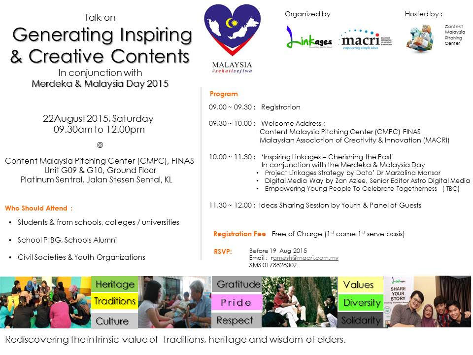 Yo yo! I will be speaking at a Project Linkages talk on ‘Generating Inspiring and Creative Content’ this Saturday, 22 August 2015, at the Content Malaysia Pitching Centre at Platinum Sentral.