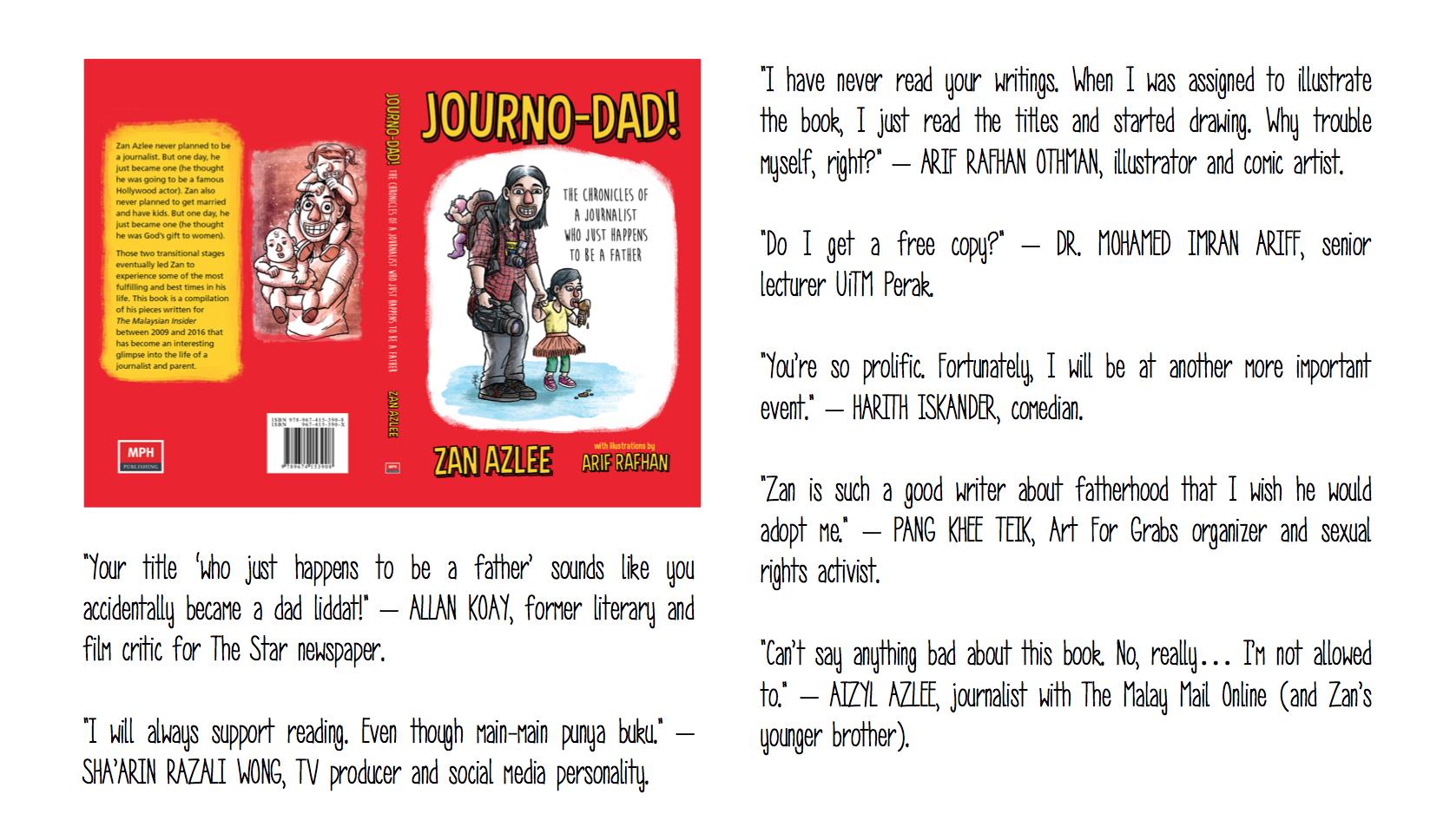 Those two transitional stages eventually led Zan to experience some of the most fulfilling and best times in his life. JOURNO-DAD! is a compilation of his column for The Malaysian Insider between 2009 and 2016 that has become an interesting snapshot of journalism and parenthood.