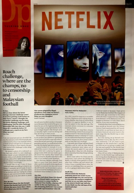 Roach challenge, where are the champs, no to censorship and Malaysian football